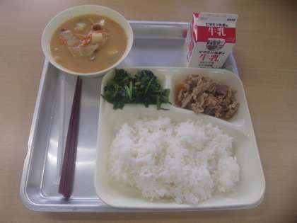 今日の献立は、豚肉のしょうが焼き、なめこのみそ汁、ほうれんそうのごまあえ、ごはん、牛乳です。