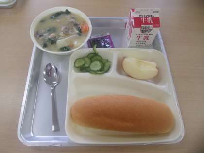今日の献立は、鶏肉ときのこのシチュー、きゅうりのピクルス、りんご、コッペパン、ブルーベリージャム、牛乳です。