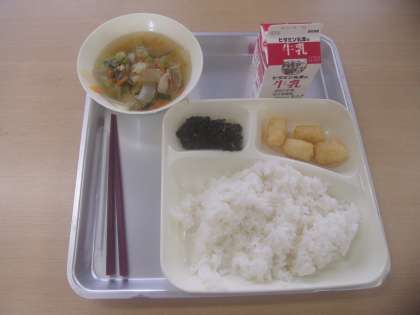 今日の献立は、いかてんぷら、五目汁、のりのつくだ煮、ごはん、牛乳です。
