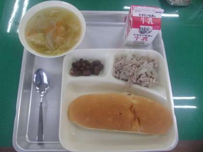 今日の献立は、豚肉のバジル焼き、スープ、うずら豆のグラッセ、おさつパン、牛乳です。