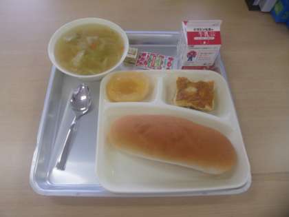 今日の献立は、ツナポテトオムレツ、ケチャップ、スープ、白桃(缶)コッペパン、バター、牛乳です。