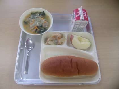 今日の献立は、さけのマリネ、肉だんごと押麦のスープ、りんご、黒糖パン、牛乳です。