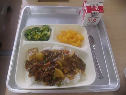 10日の給食は、冬野菜のカレー、ブロッコリーとコーンのサラダ、黄桃(カット缶)ごはん、牛乳。(エネルギー:625kcal)