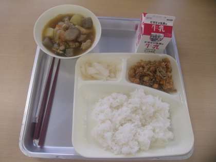 12日の給食は、鶏肉と野菜の煮もの、じゃこ豆、かぶのゆず風味、ごはん、牛乳。(エネルギー:599kcal)