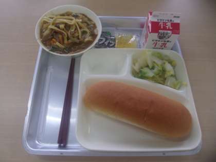 今日の献立は、カレーうどん、はくさいのおひたし、ミニフィッシュ、コッペパン、マーマレードジャム、牛乳です。