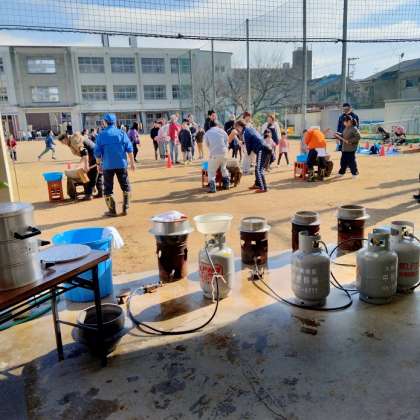 1月13日(月祝)にたくさんの地域の方々にご協力いただき、PTAもちつき大会が行われました。先週までの寒さも和らぎ、3つもの臼を使った盛大なもちつき大会でした。