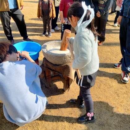 もちつきは初めてという子どももたくさんいて、重たい杵に悪戦苦闘しながらも地域に方に補助していただき、もちつき体験をすることができました。