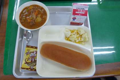 今日の献立は、ビーフシチュー、カリフラワーとコーンのサラダ、カレーフィッシュ、黒糖パン、牛乳です。