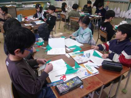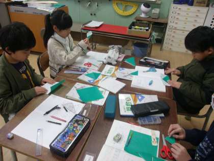 折り紙を折ったり切ったりして、二等辺三角形と正三角形を
