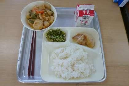 今日の献立は、鶏肉のおろしじょうゆかけ、一口がんもとじゃがいものみそ煮、みずなの煮びたし、ごはん、牛乳です。