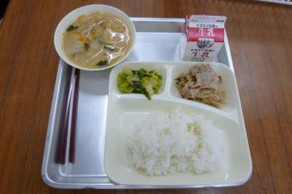 今日の献立は、豚肉のごまだれ焼き、みそ汁、きくなとはくさいのおひたし、ごはん、牛乳です。