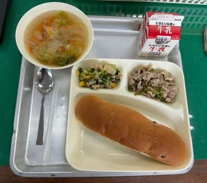 今日の献立は、豚肉のオイスターソース焼き、中華スープ、ツナとチンゲンサイのいためもの、レーズンパン、牛乳です。