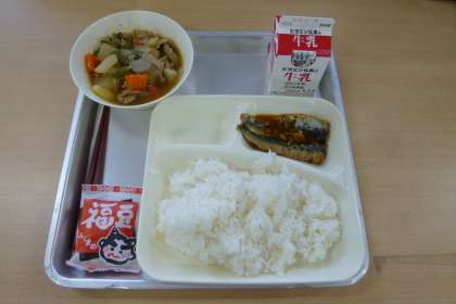 今日の献立は、いわしのしょうがじょうゆかけ、含め煮、いり大豆、ごはん、牛乳です。
