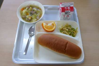 今日の献立は、ポトフ、カレーソテー、いよかん、黒糖パン、牛乳です。