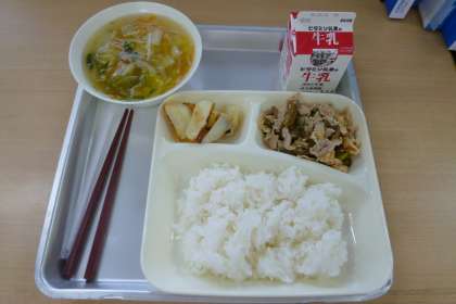 今日の献立は、豚肉と干しずいきのみそ煮、五目汁、焼きじゃが、ごはん、牛乳です。