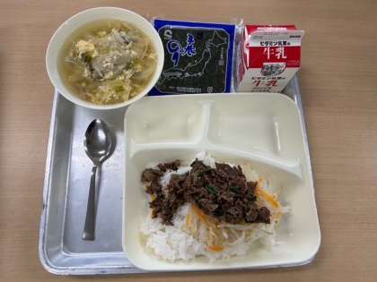 今日の献立は、キンパ(ごはん・肉・ナムル)、焼きのり、卵の中華スープ、牛乳です。