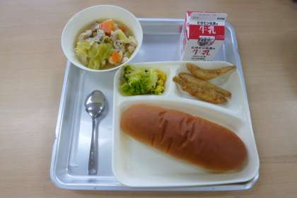 今日の献立は、わかさぎフライ、スープ煮、ブロッコリーとコーンのサラダ、黒糖パン、牛乳です。