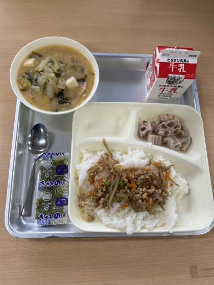 17日(月)の献立は、鶏ごぼうご飯(ごはん)きざみのり、みそ汁、焼きれんこん、牛乳です。