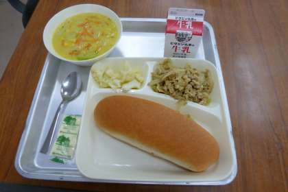 今日の献立は、豚肉のカレー風味焼き、コーンスープ、カリフラワーのピクルス、コッペパン、ソフトマーガリン、牛乳です。