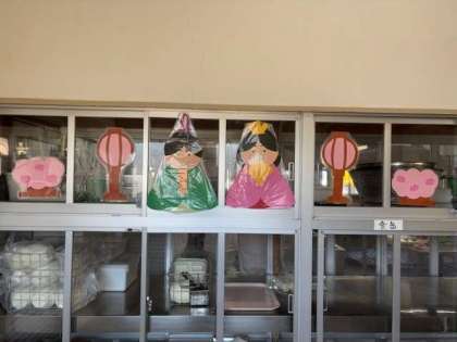 給食室では、節分が終わって、ひなまつりの飾りに変わっています。