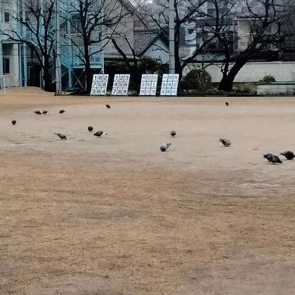 暖かくなってきたためか、子どもたちが運動場に出ていないお昼の時間帯にたくさんのハトさんたちが運動場に集まってランチタイムを楽しんでいます。