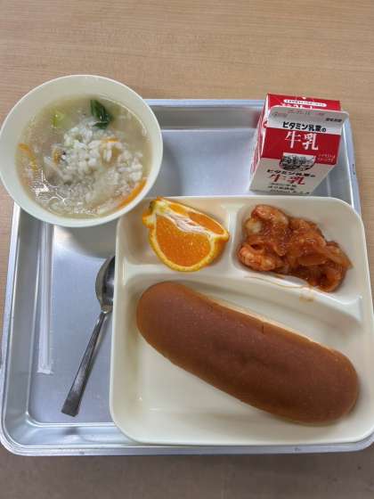今日の献立は、えびのチリソースいため、中華がゆ、デコポン、黒糖パン、牛乳です。