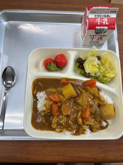 今日の献立は、チキンカレーライス(ごはん)、ビーンズサラダ、いちご、牛乳です。