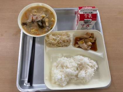 今日のこんだては、焼きとり、みそ汁、もやしのゆずの香あえ、ごはん、牛乳です。