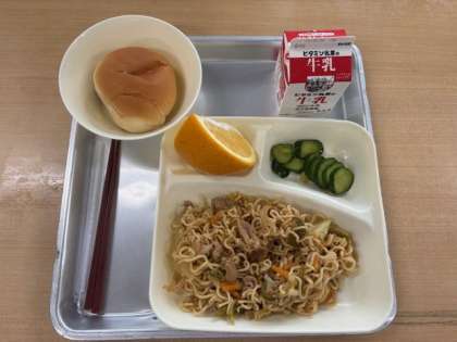 今日の献立は、焼きそば、きゅうりのしょうがづけ、あまなつかん、ミニコッペパン、牛乳です。
