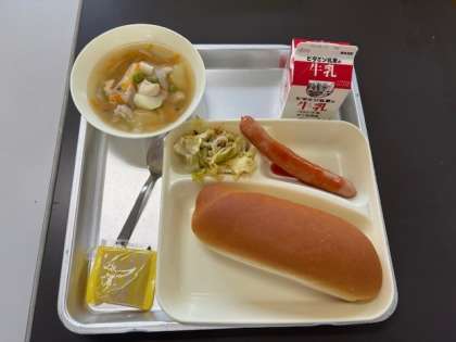 今日の献立は、ウインナーのケチャップソース、スープ、焼きツナキャベツ、コッペパン、アプリコットジャム、牛乳です。