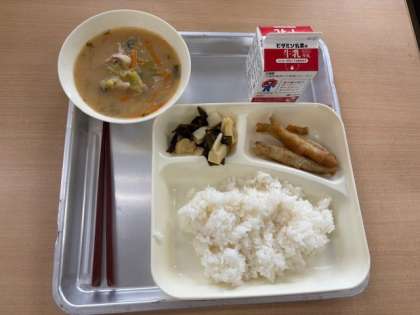 今日の献立は、きびなごてんぷら、みそ汁、わかたけ煮、ごはん、牛乳です。