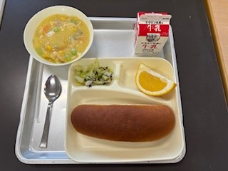 今日の献立は、鶏肉とコーンのシチュー、キャベツのひじきドレッシング、かわちばんかん、黒糖パン、牛乳です。