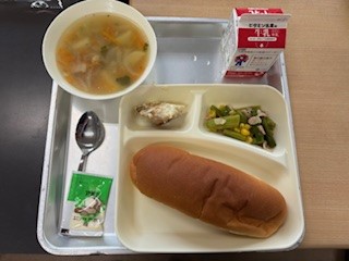 今日の献立は、かつおのガーリックマリネ焼き、押麦のスープ、グリーンアスパラガスのソテー、コッペパン、ソフトマーガリン、牛乳です。