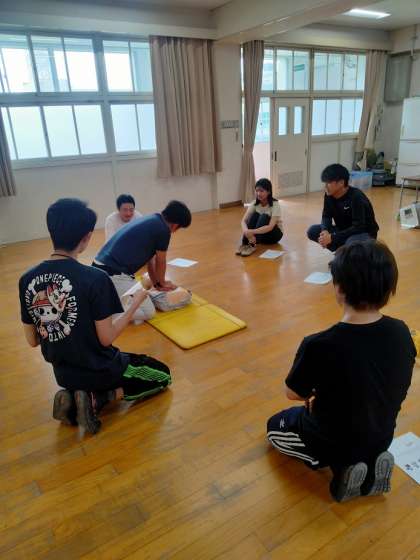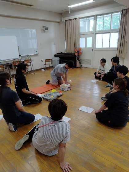 子どもたちがとても楽しみにしている6月第3週のプール開きに向けて、『救急救命講習会』を実施しました。万が一の状況を想定して「胸骨圧迫」と「AEDの使い方」の実施練習をしました。