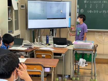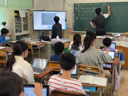 ノートに書いたみんなの考えを電子黒板に映し出して見合います。