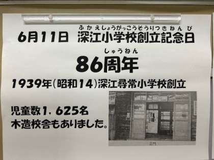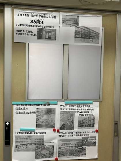 今週は、校長室前に深江小学校の歴史についての掲示をしています。
