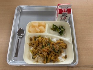 今日の献立は、和風カレー丼(ごはん)、オクラの甘酢あえ、和なし(カット缶)、牛乳です。