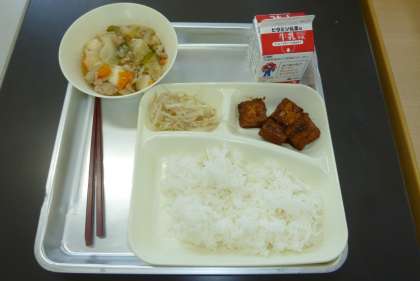 今日の献立は、八宝菜、あつあげの中華みそだれかけ、もやしの中華あえ、ごはん、牛乳です。
