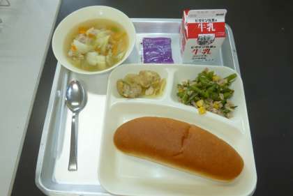 今日の献立は、鶏肉のカレー風味焼き、スープ、ツナとさんどまめのソテー、コッペパン、ブルーベリージャム、牛乳です。