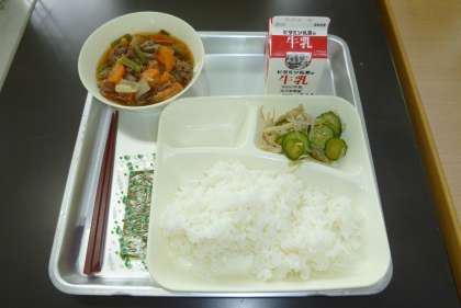 今日の献立は、牛肉と野菜のいため煮、きゅうりともやしのおひたし、焼きのり、ごはん、牛乳です。