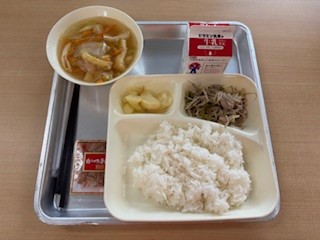 今日の献立は、ゴーヤチャンプルー、かつお節(袋)、五目汁、焼きじゃが、ごはん、牛乳です。
