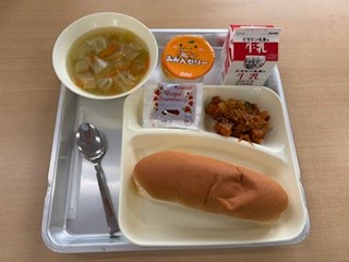 今日の献立は、かぼちゃのミートグラタン、スープ、みかんゼリー、コッペパン、いちごジャム、牛乳です。
