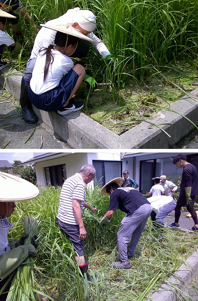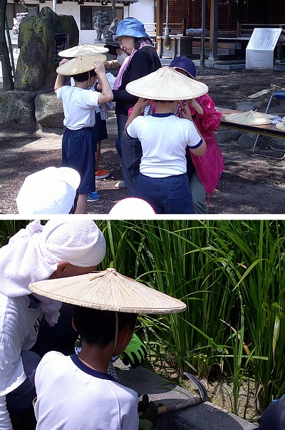 地域の方々に教えていただきながら、まず菅笠をかぶります。そして鎌を使ってていねいに菅を刈り取っていきます。なかなかできない貴重な体験です。