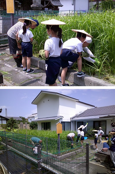 この学年は3年生の時に、この田んぼに菅の苗を植えました。自分たちで植えた菅が立派に成長した様子を見てびっくりしたのではないでしょうか。