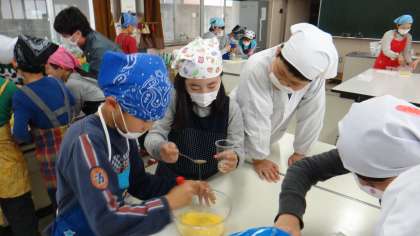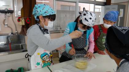 4年生は、食育の授業でゲストティーチャーに来ていただき「マヨネーズづくり」を行いました。卵黄に酢を加え、一生懸命かき混ぜていました。だんだんマヨネーズらしくなってきました。