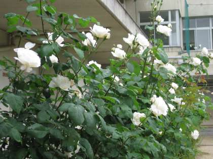 バラの花言葉は一般には「美、愛情」ですが、本校庭にある白いバラの花言葉は「私はあなたにふさわしい」です。