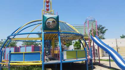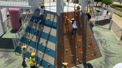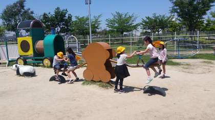 いろいろな種類の遊具がたくさんあります。みんな夢中で遊んでいます。