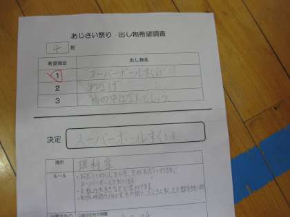 ○6月25日(土)「あじさいまつり」(土曜授業)にむけて、各班の出し物をみんなで検討し、決定しました。いろいろな出店がありそうで、楽しみな一日になりそうです。