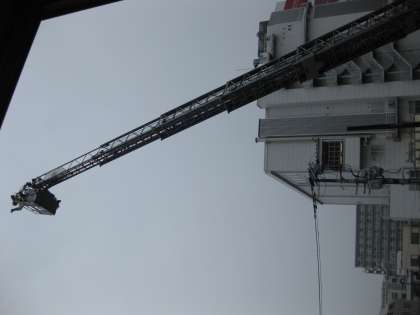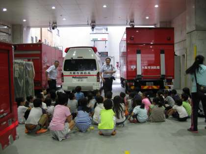 その後、救急車の説明をお聞きし、はしご車のはしごを実際に伸ばしていただき見学しました。はしご車のはしごの長さは41mあるそうで、だいたいビルの高さでいうと12〜13階に相当するそうです。(隊長さんの話では、はしご車の先端はかなり揺れるそうで、旋回するとさらに大きく揺れるようです。だから、日頃から隊員は体を鍛えています。「すごいね!」)