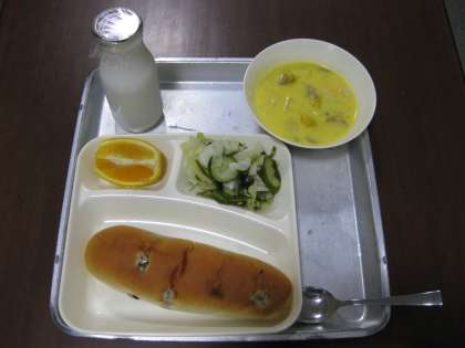 献立:かぼちゃのクリームシチュー、ミックス海藻のサラダ、オレンジ、パン、牛乳